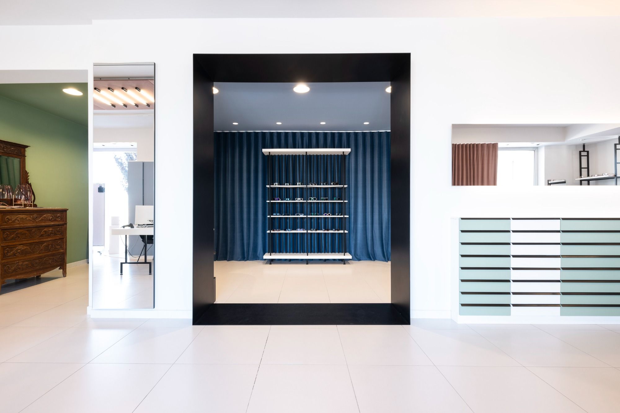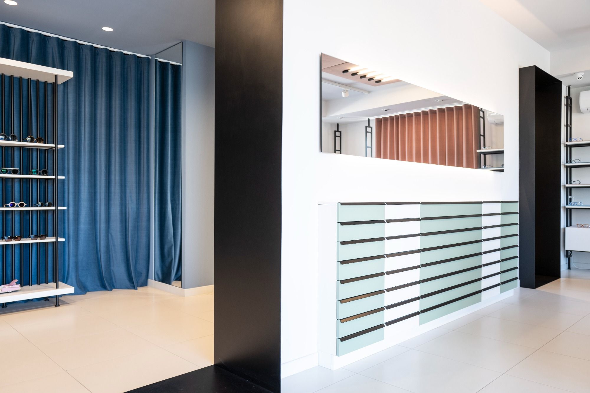 In un luogo destinato precedentemente ad un asilo comunale nasce un Eyewear Concept Store per il nuovo brand Salvomarchi Occhiali. La volontà del concetto progettuale è stata quella di trasformare uno spazio inteso come contenitore di oggetti materiali destinati alla vendita in un luogo contenitore di qualità sensorialmente percepibili. Quattro postazioni per la scelta, quattro modalità per essere comodi e far si che il cliente possa dedicare del tempo alla giusta scelta di un accessorio funzionale che può diventare anche motivo di cambiamento. Materiali basic, strutture razionali, particolare attenzione è stata data al colore, al senso del tatto e all'acustica, con l’utilizzo del tessuto che rende lo spazio ovattato, caldo ed accogliente. In velluto rosa e lampade esclusivamente LED è l’installazione a soffitto, un nastro brillante di 15 metri che unisce l'area centrale e la illumina.
